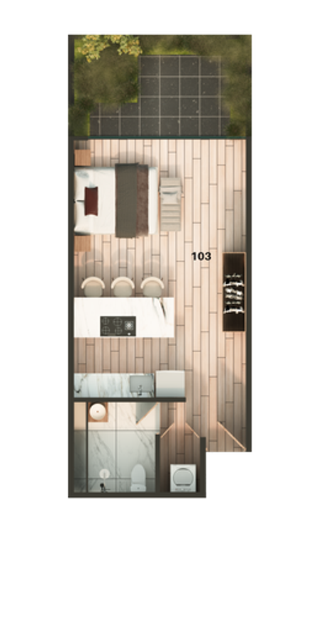 Este loft, 104,  mide 50 m2 habitables más una terraza de 19 m2. 1 recámara, 1 baño, comedor, cocina  y terraza. Con un concepto de arquitectura de la más alta calidad, acorde con el estilo de vida que se ha convertido en una tendencia mundial y un diseño en el que sobresalen la eficiencia y aprovechamiento de espacios, Casa Roma 240 te ofrece los mejores acabados:  mármol en baños y cocinas, madera de ingeniería y barras de granito
