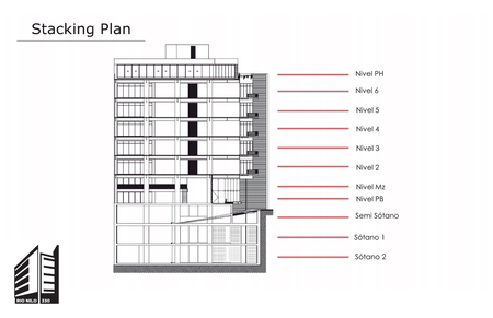 El edificio cuenta con 6 niveles de oficina de 377 m2 promedio con 9 cajones de estacionamiento por oficina y una excelente área comercial sobre la esquina de Circuito Interior, Melchor Ocampo y Río Nilo. $20 USD m2 de las oficinas.