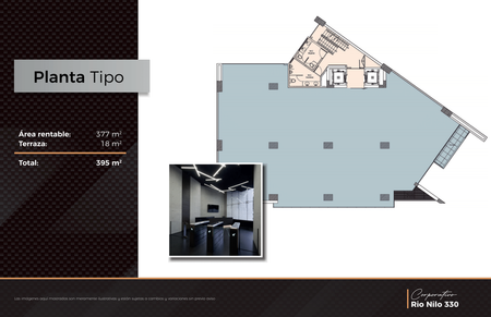 Esta oficina se ubica en piso 6 y  cuenta con 337 m2 de área rentable, 335 m3 de área útil y 18 m2 de terraza. 9 cajones de estacionamiento.